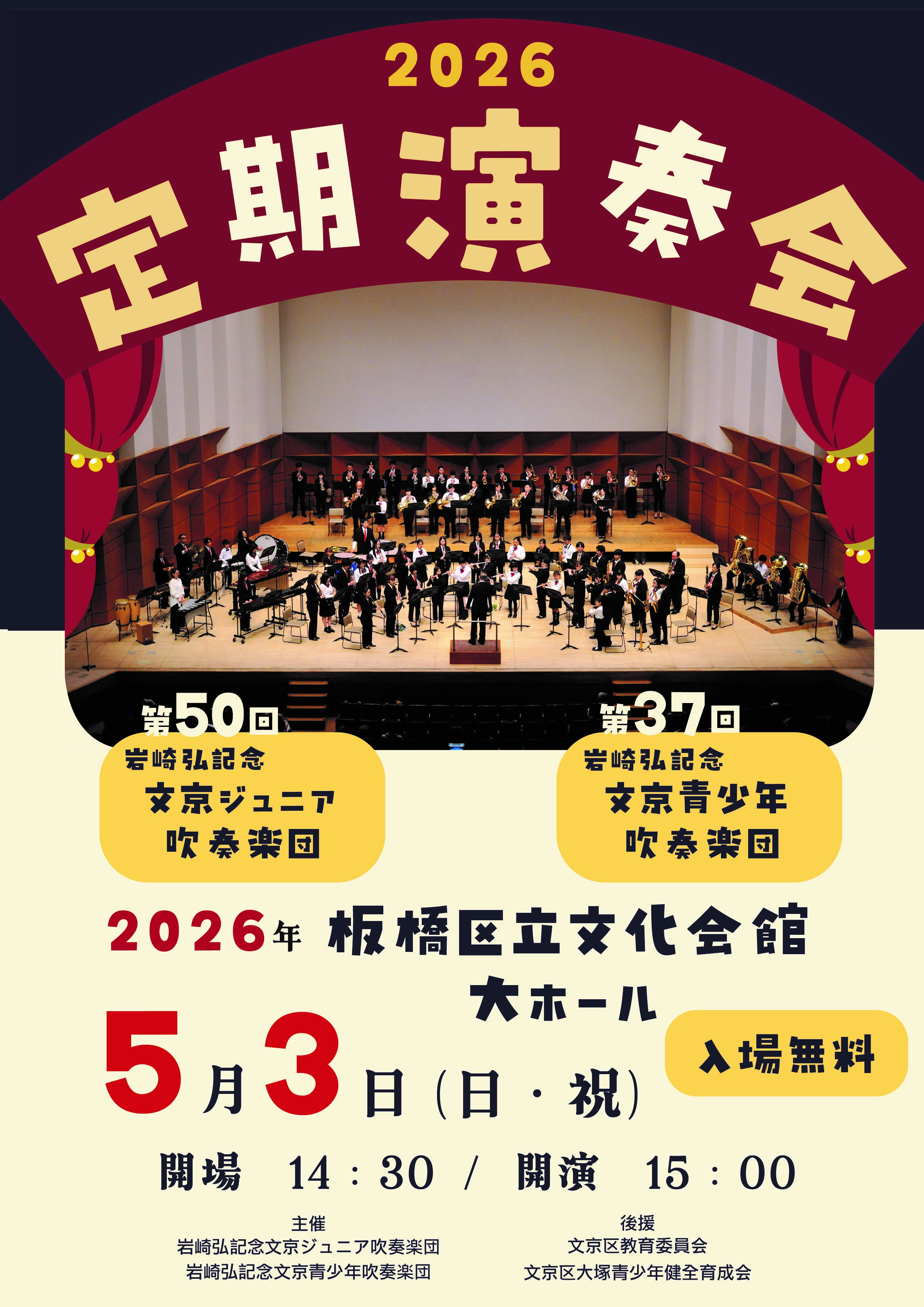 | 公演 岩崎弘記念文京ジュニア・青少年吹奏楽団 定期演奏会 | 15:00開演(14:30開場) | 大ホール | |