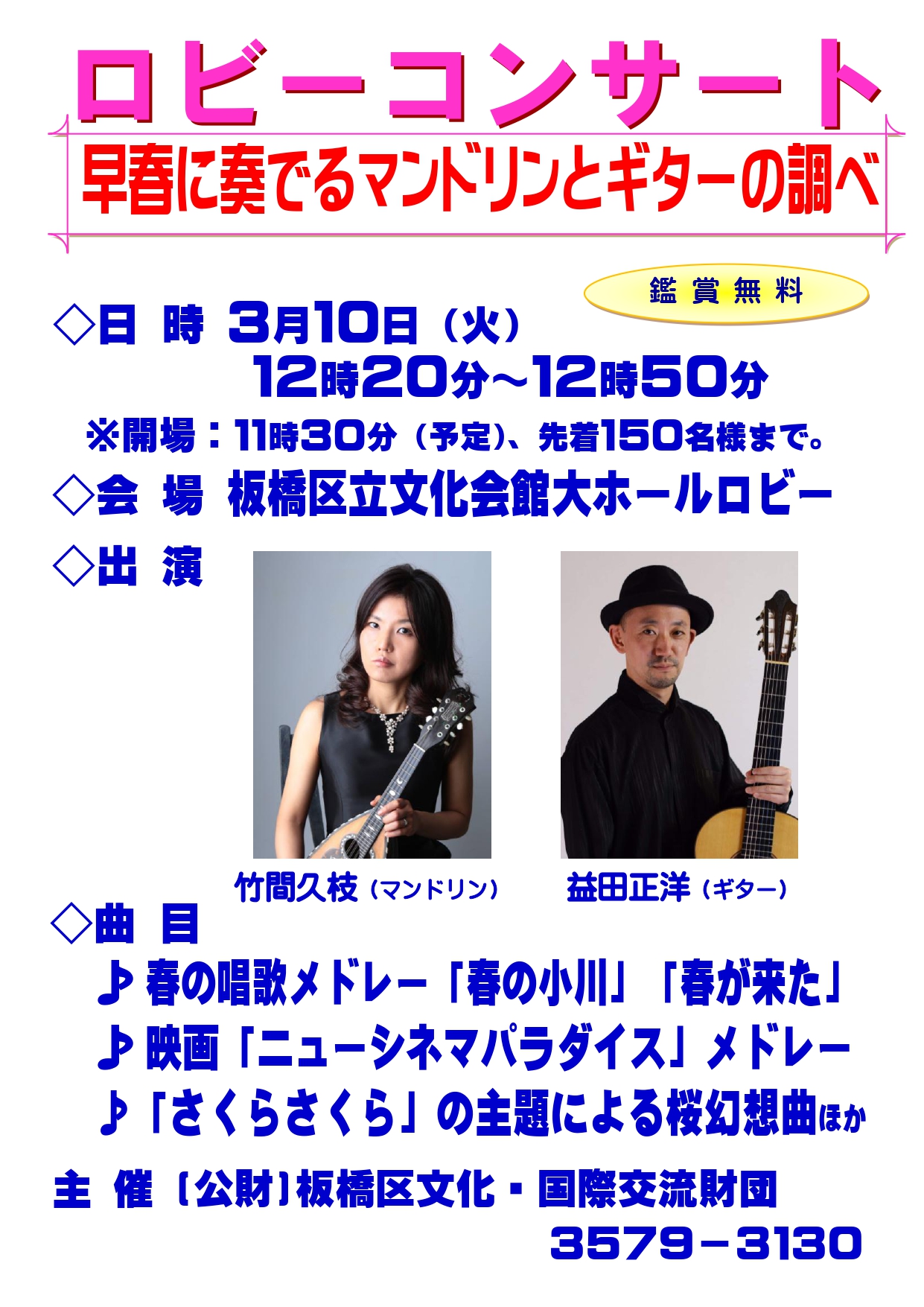 3月ロビーコンサート- 3月10日(火)12時20分~12時50分 ※開場:11時30分(予定)