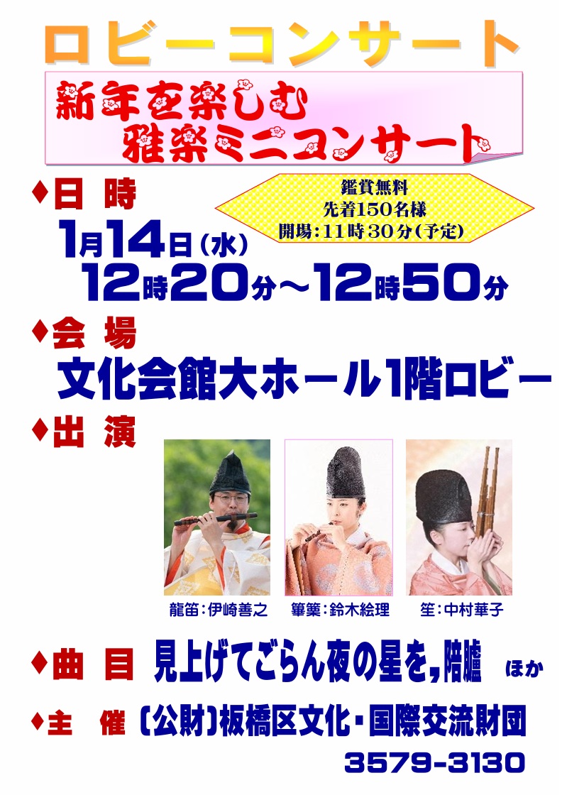 1月ロビーコンサート- 1月14日(水)12時20分~12時50分 ※開場:11時30分(予定)