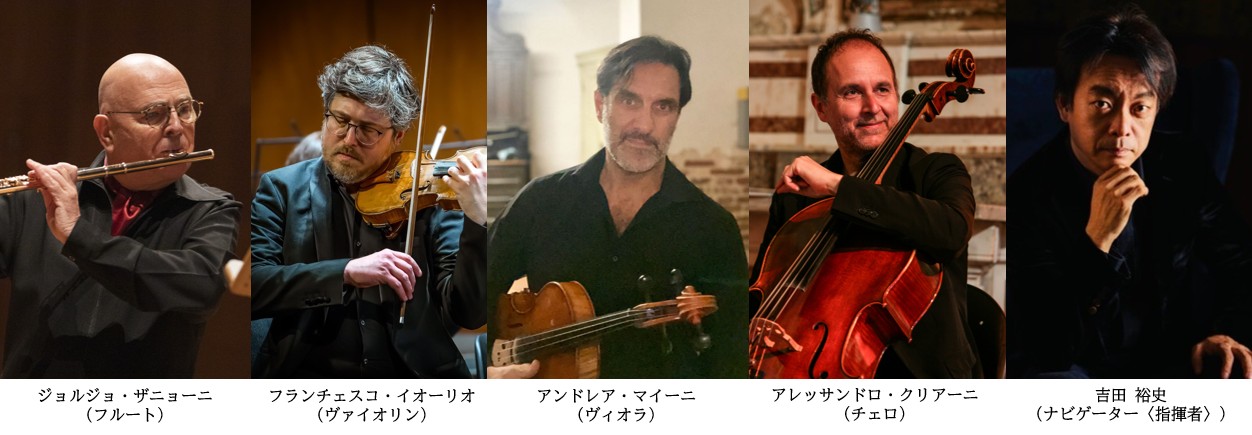 | 出演・講師 | ジョルジョ・ザニョーニ(フルート) フランチェスコ・イオーリオ(ヴァイオリン) アンドレア・マイーニ(ヴィオラ) アレッサンドロ・クリアーニ(チェロ) 吉田 裕史(ナビゲーター) ※当初出演を予定しておりましたロベルト・モリネッリ氏(ヴィオラ)は、都合により出演ができなくなりました。代わりましてアンドレア・マイーニ氏(ヴィオラ)が出演いたします。 |