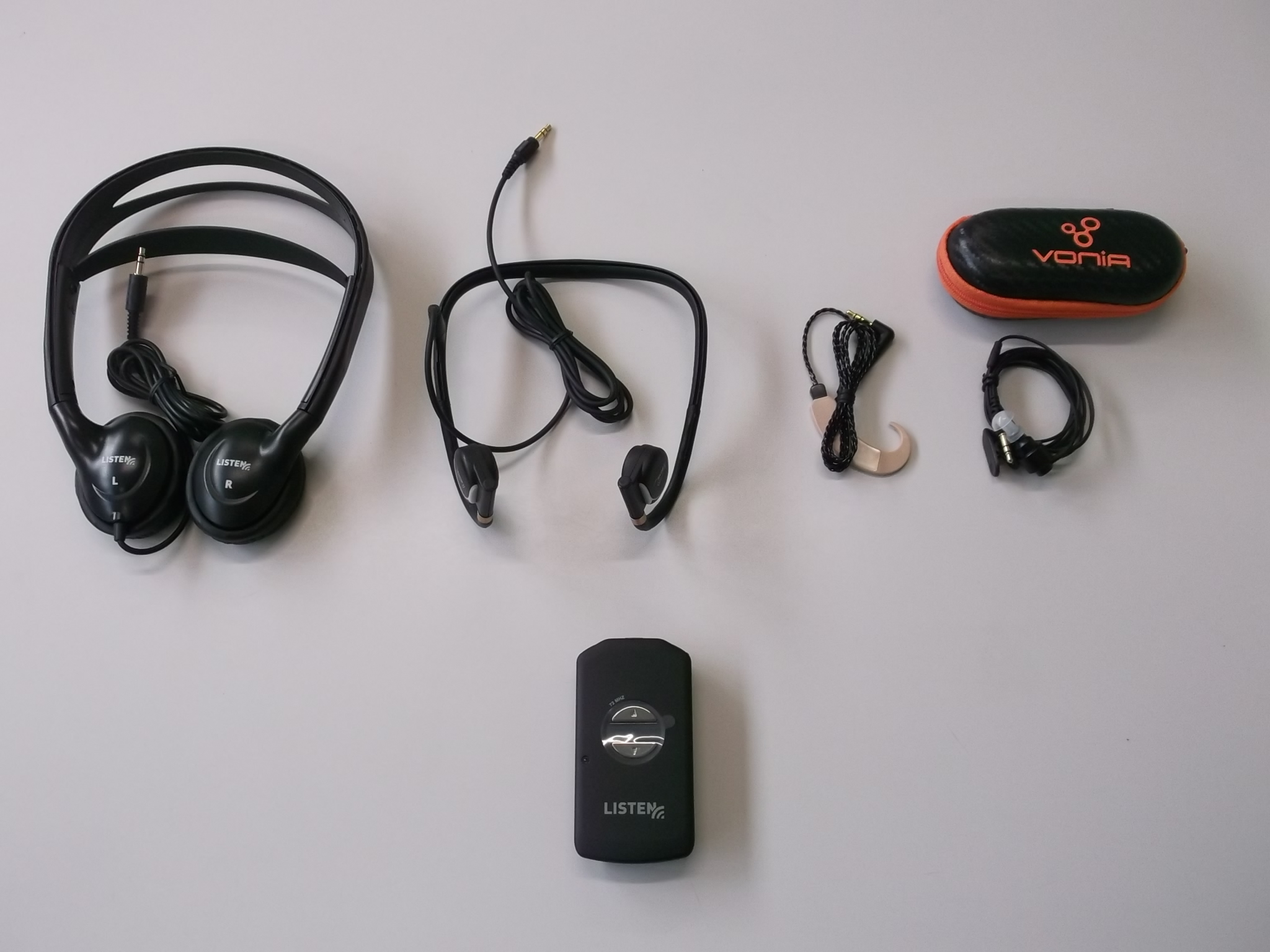 受信機を貸し出して、オープンエアーヘッドフォン・片耳骨伝導イヤホン・骨伝導ヘッドフォン・お手持ちの補聴器に取り付けるシルエットインダクターの4種類から選べます