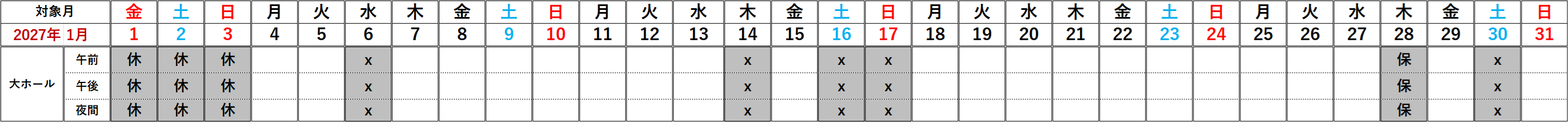 2027年1月大ホールの空き日程で、利用できないピアノは以下の通りとなっております。