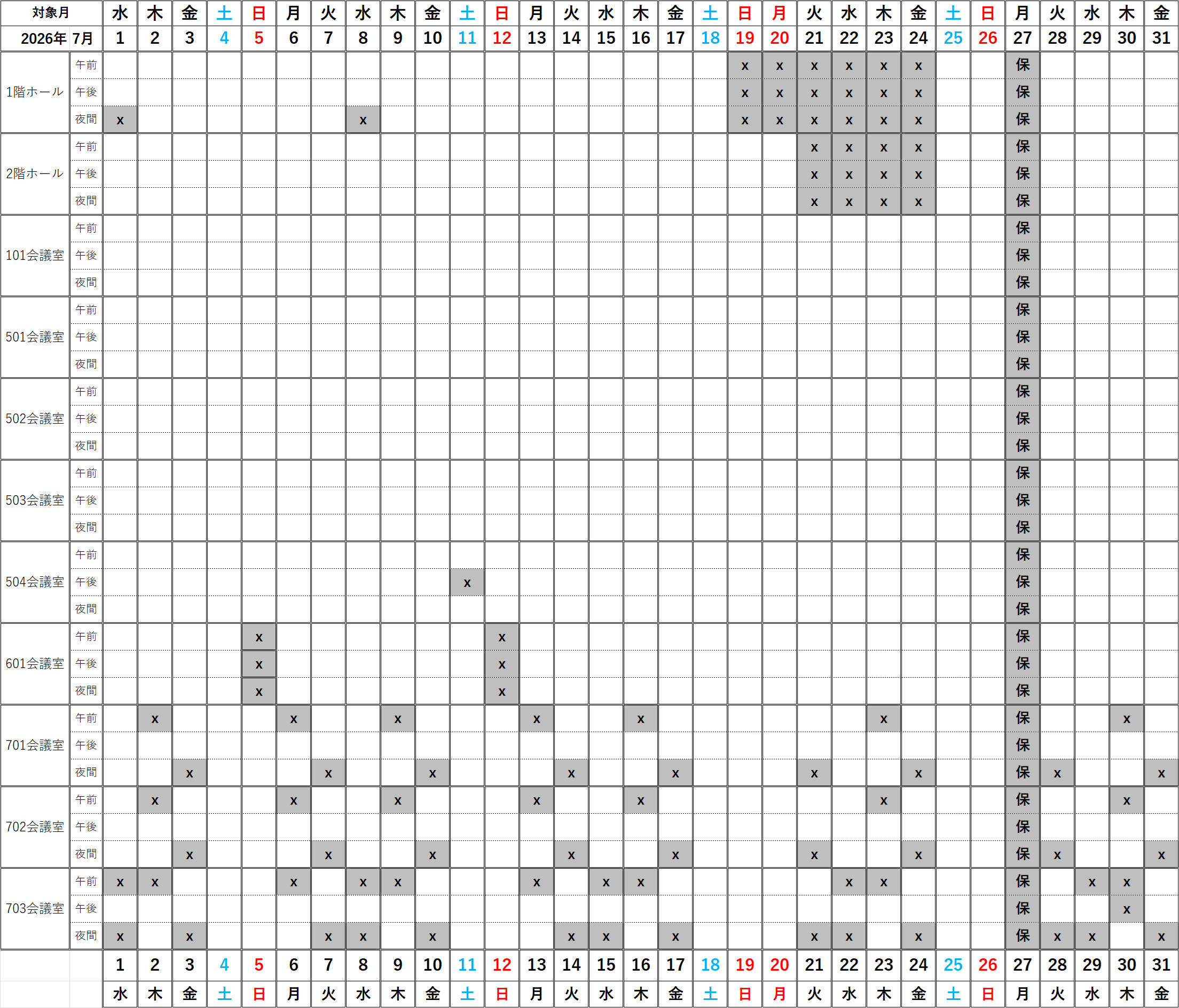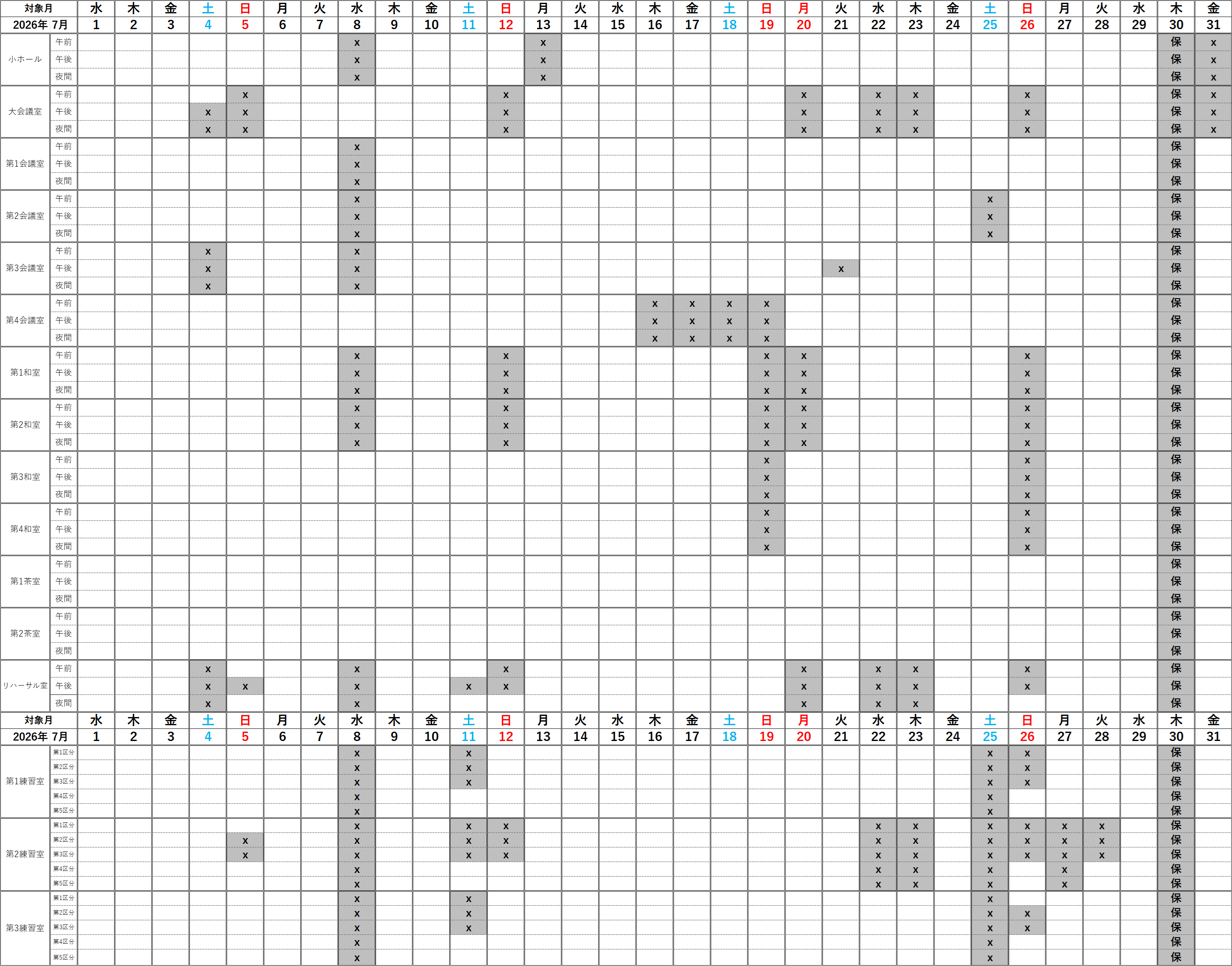 ※大ホールの空いている日で予約ができない諸室は、下記の通りとなります。