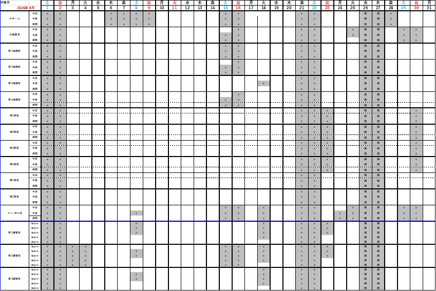 2026年8月小ホールの空き日程で、利用できないピアノは以下の通りとなっております。