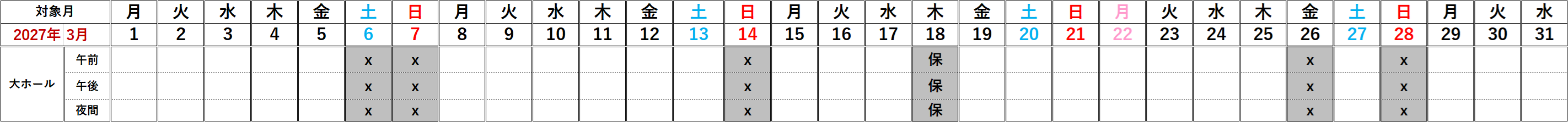 2027年3月大ホールの空き日程で、利用できないピアノは以下の通りとなっております。