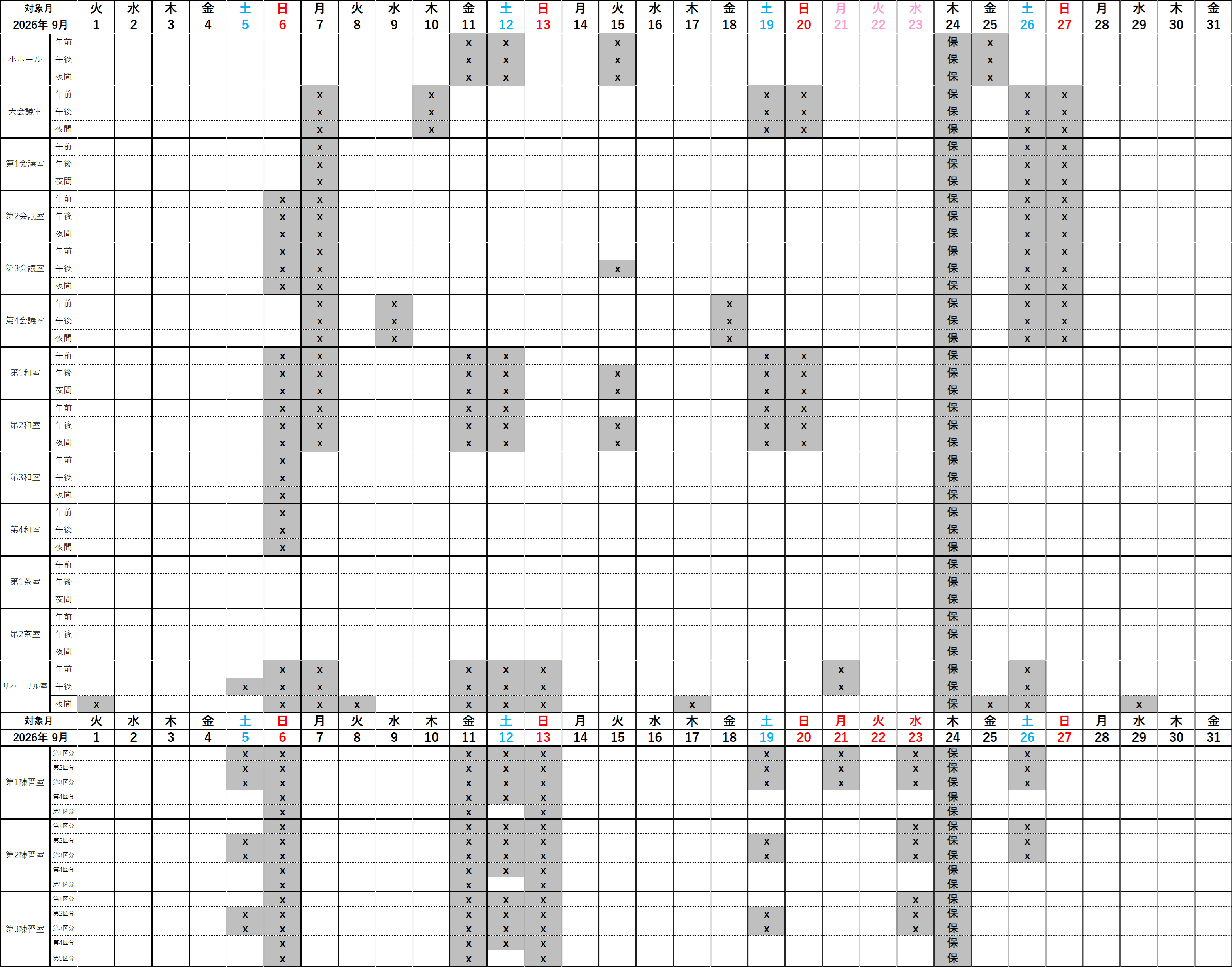 ※大ホールの空いている日で予約ができない諸室は、下記の通りとなります。
