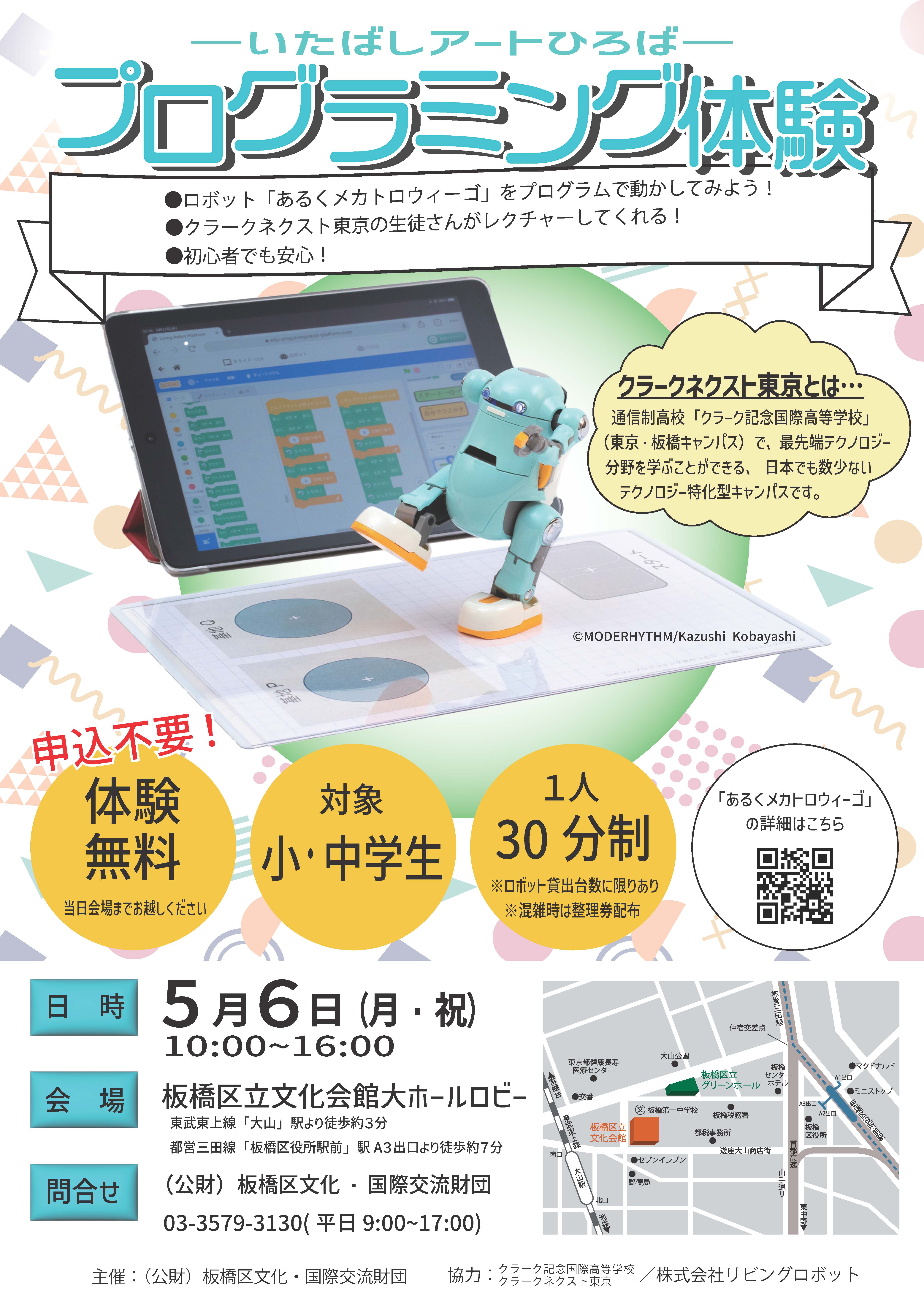 | 主催者 | 主催:(公財)板橋区文化・国際交流財団 協力:クラーク記念国際高等学校、クラークネクスト東京 / 株式会社リビングロボット |