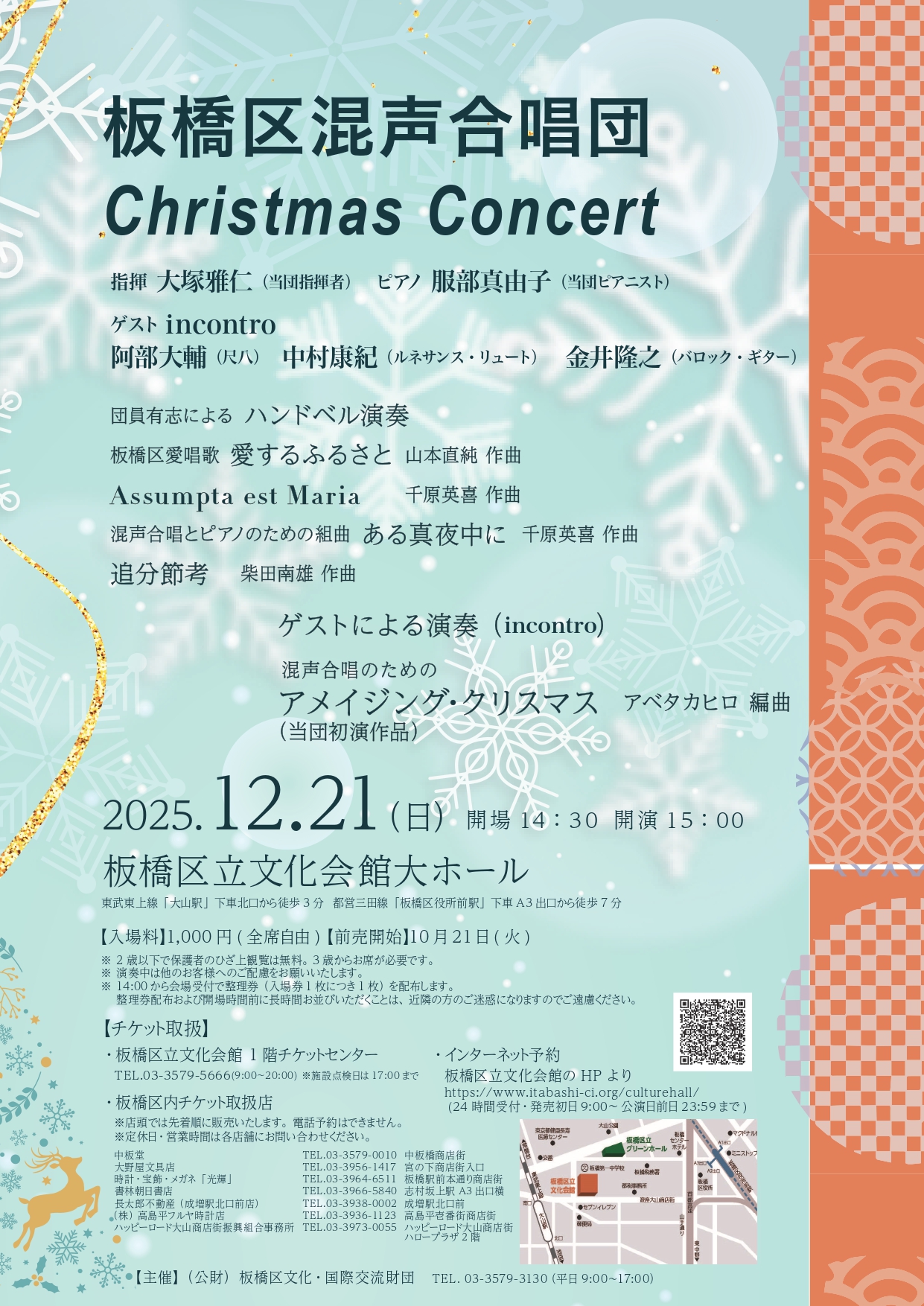 板橋区混声合唱団 クリスマスコンサート 2025- 2025/12/21(日)15:00開演 (14:30開場)※14:00より整理券を配布いたします。整理券配布及び開場時間前に長時間お並び頂くことは近隣の方のご迷惑となりますのでご遠慮ください。