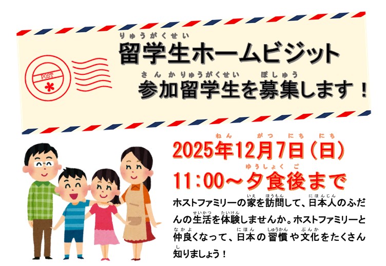 留学生ホームビジット- 2025年12月7日(日) 11:00に区立グリーンホールでホストファミリーと顔合わせ~各家庭で夕食後解散(20:00まで)