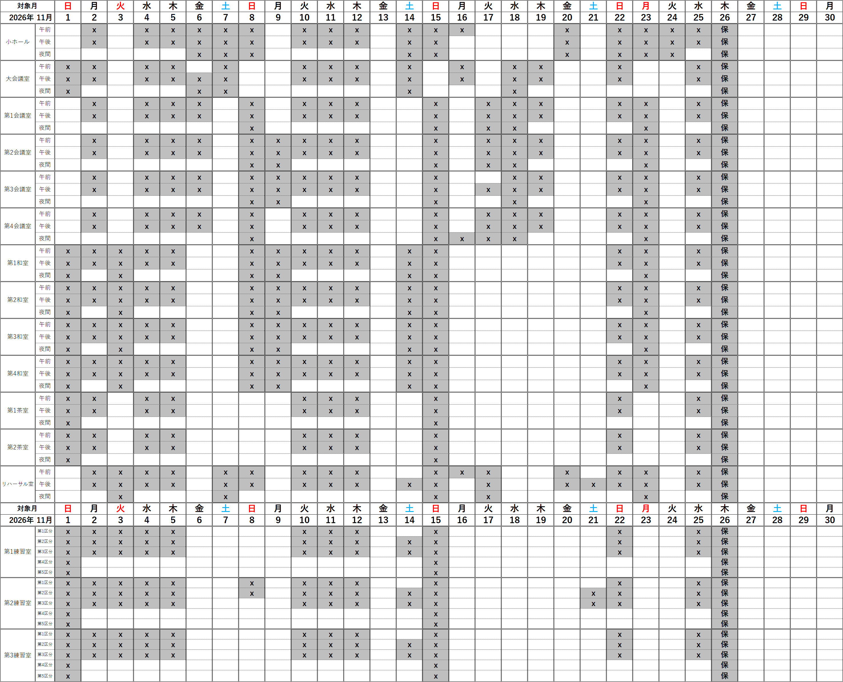 2026年11月、小ホールの空き日程で、利用できないピアノは以下の通りとなっております。