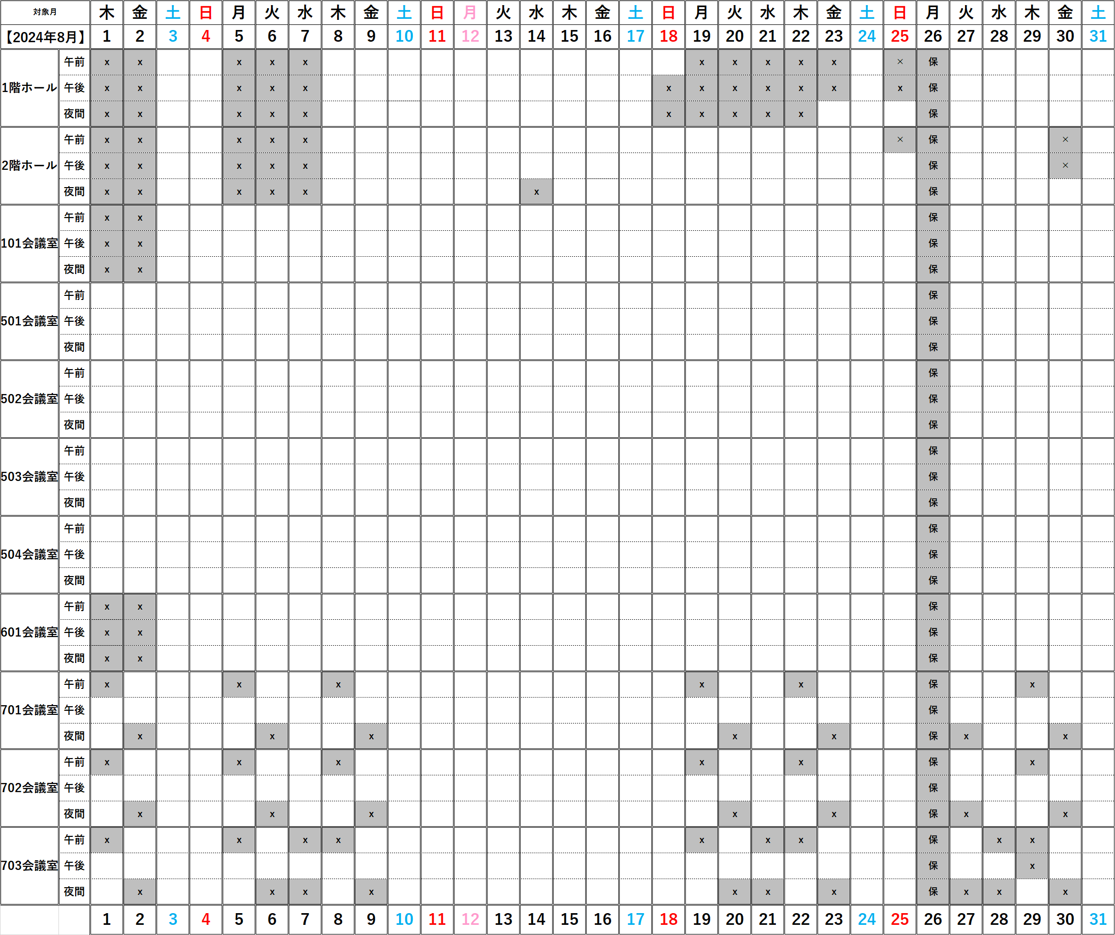 ※大ホールの空いている日で予約が出来ない諸室は下記になります。