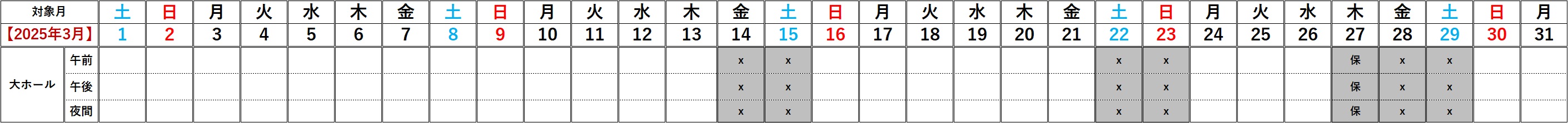 2025年3月の大ホールの空き日程で、下記日程のピアノが利用できません。