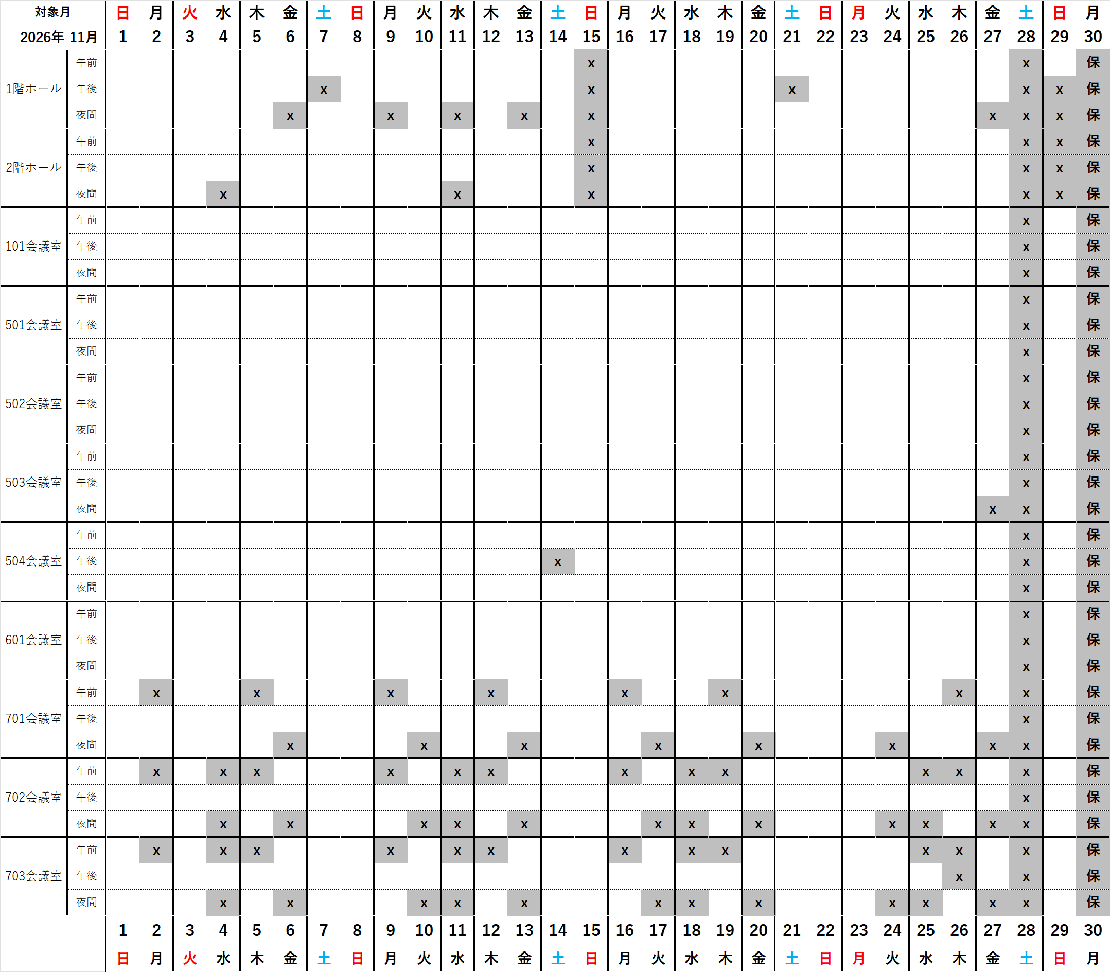 2026年11月、小ホールの空き日程で、利用できないピアノは以下の通りとなっております。