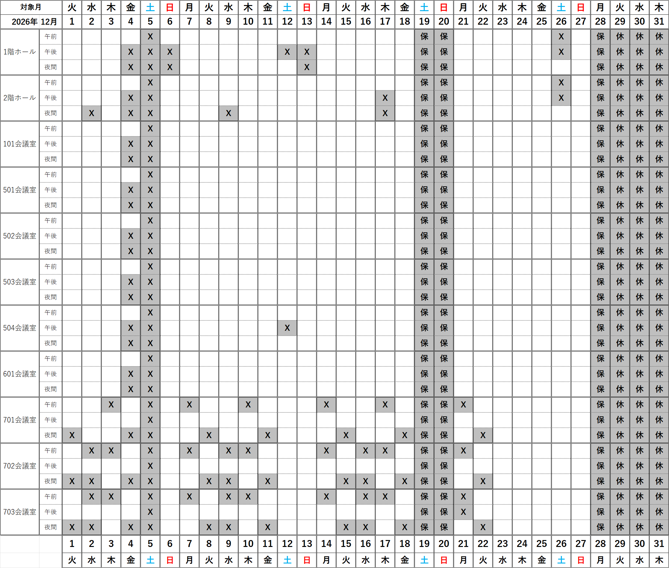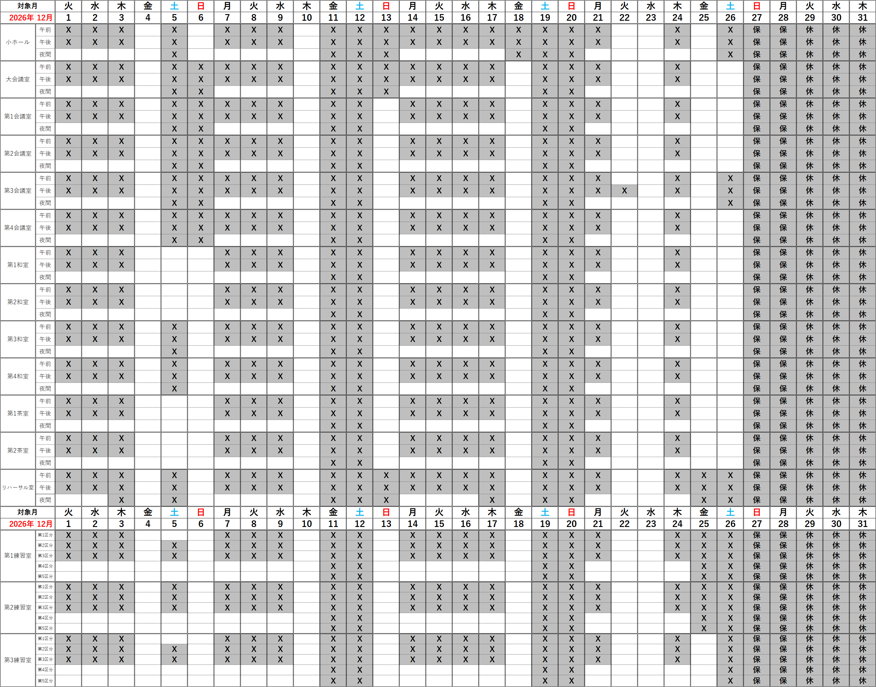 2026年12月、小ホールの空き日程で、利用できないピアノは以下の通りとなっております。